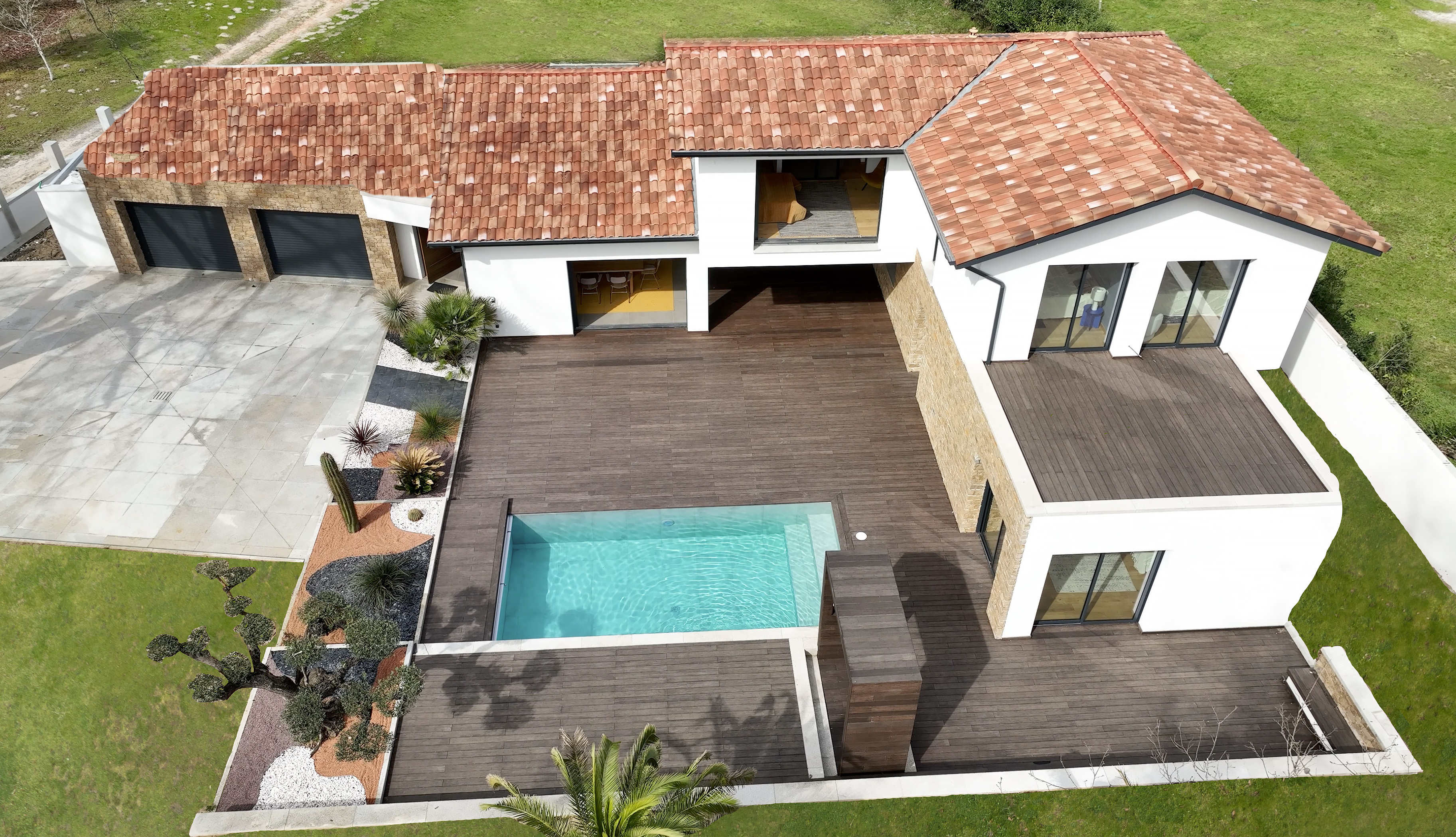 Design chic, matériaux haut de gamme et finitions sur mesure, cette villa construite en 2022 entourée d'un terrain plat de 1400 m² donnant sur une zone naturelle, se distingue par la qualité de ses prestations. Ses quelques 255 m² offrent des volumes exceptionnels tant à la zone de vie qu'à chacune des quatre chambres. Lumineuse du fait de son exposition sud elle se compose comme suit, au rez-de-chaussée : entrée avec système anti-vue et accès garage, espace cuisine ouverte et cave à vin, arrière cuisine, salle à manger avec baies à galandage donnant sur terrasse et piscine, salon donnant sur une deuxième terrasse, wc et lave main, bureau / chambre, suite parentale vue piscine et accès terrasse, dressing, salle de douche, double vasque, meubles sur mesure, panière à linge intégrée et wc. À l'étage : Deux chambres donnant sur un toit terrasse, salle de bain avec baignoire et douche, wc, suite avec baie à galandage vue piscine, coin bureau, salle de douche, wc. Avec 215 m² de terrasse dont une partie couverte, sa piscine carrelée de 8 mètres de long, au sel avec cascade et volet roulant intégré ainsi que la douche extérieure chauffée et son coin spa la vie s'organise tant à l'intérieur qu'à l'extérieur. Le terrain est entièrement clôturé. Un double garage d'environ 60 m² avec portes électriques donne un accès direct dans l'entrée de la villa. Environ 120 m² d'espace de parking est également prévu à l'extérieur, zone délimitée par un sol en granite. Cette villa pourvue de domotique, double vitrage anti-effraction, climatisation réversible bi-zone, système électrique extérieur, arrosage automatique, éléments en bois intérieur en chêne et extérieur en bambou ainsi sur ses murs en pierres du Lot taillées une à une à la main, offre des prestations d'une grande qualité. Située à 18 minutes des plages Landaises, 45 minutes de l'aéroport de Biarritz et 25 min d'Hossegor grâce à son emplacement à proximité du réseau autoroutier est un véritable atout pour jouir de ce cadre exceptionnel sans toutefois être excentré.